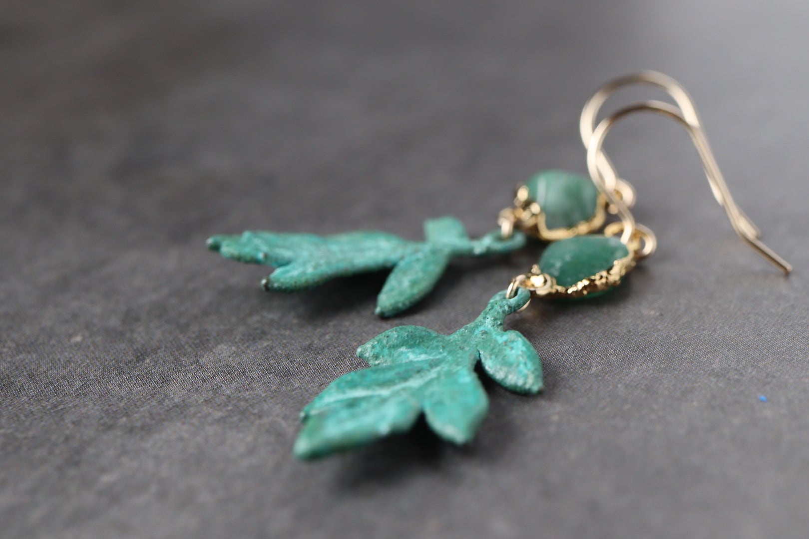 葉っぱはマットな質感で、天然石は光を受けてやさしく輝きます。