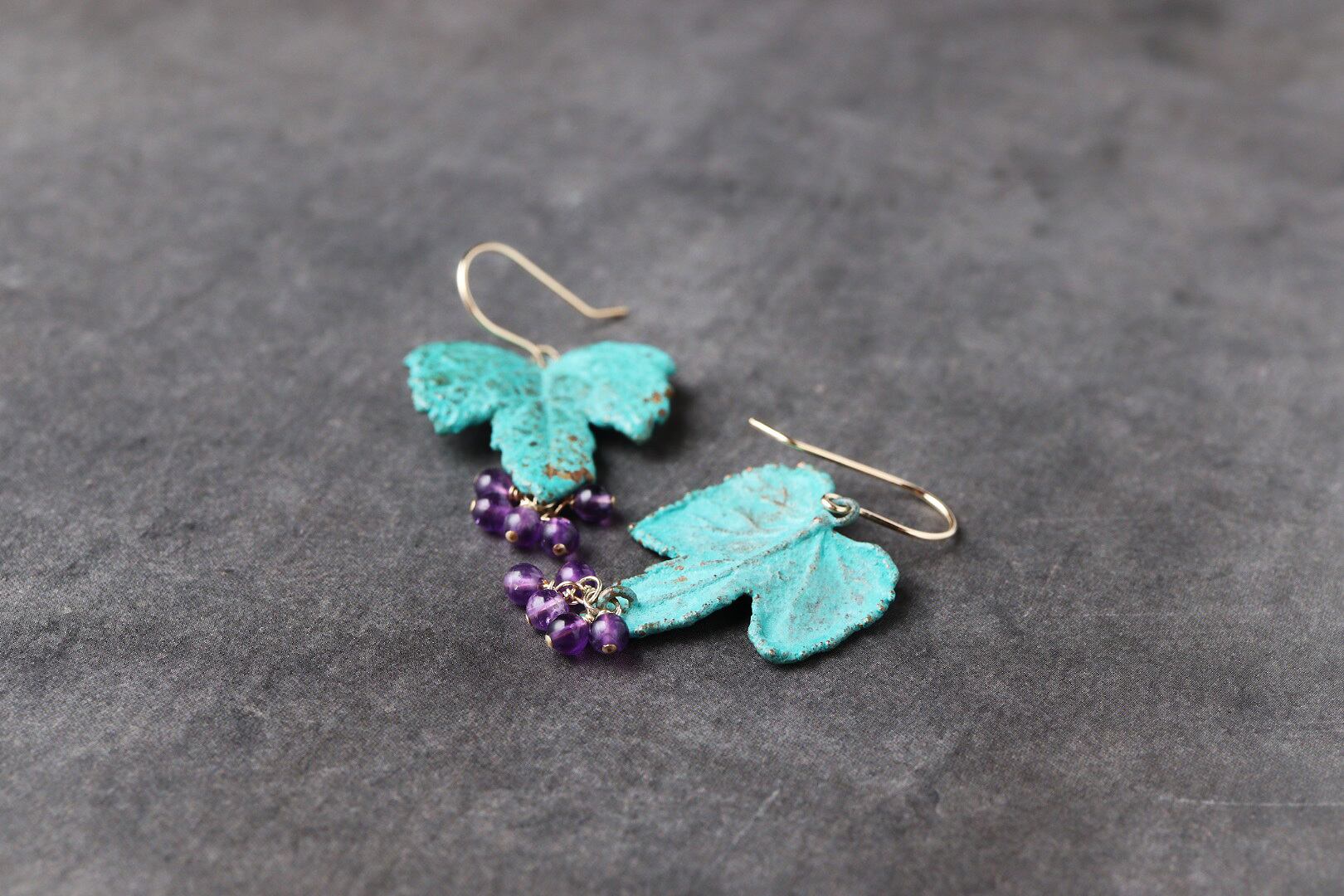 自然の色、形が美しく、青緑の葉っぱに紫のアメシストがアクセントになっています。