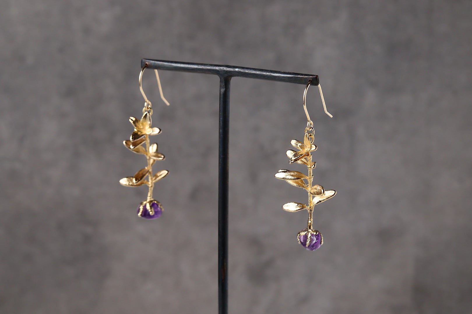 連なる小さな葉の根元にアメシストの原石を留めました。