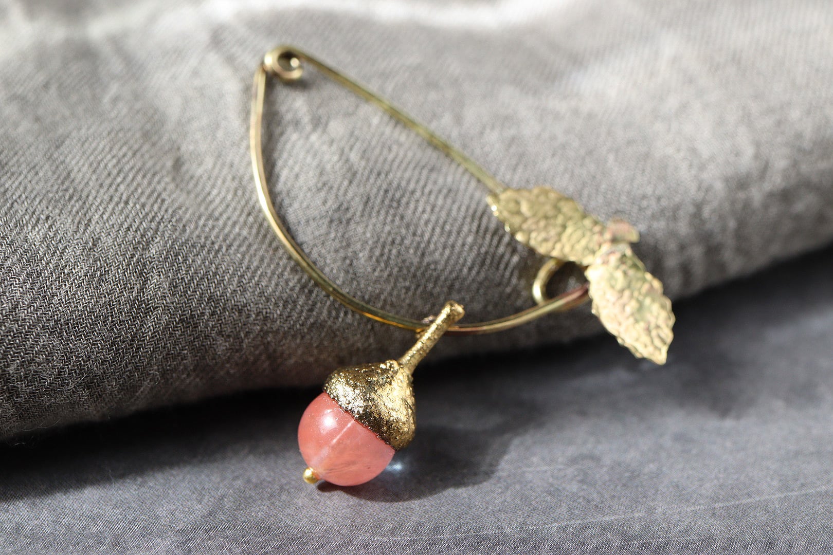 ブローチ台と葉っぱは真鍮で作り、天然石(ローズクォーツ)は角度や光の受け方で色合いが変化します。
