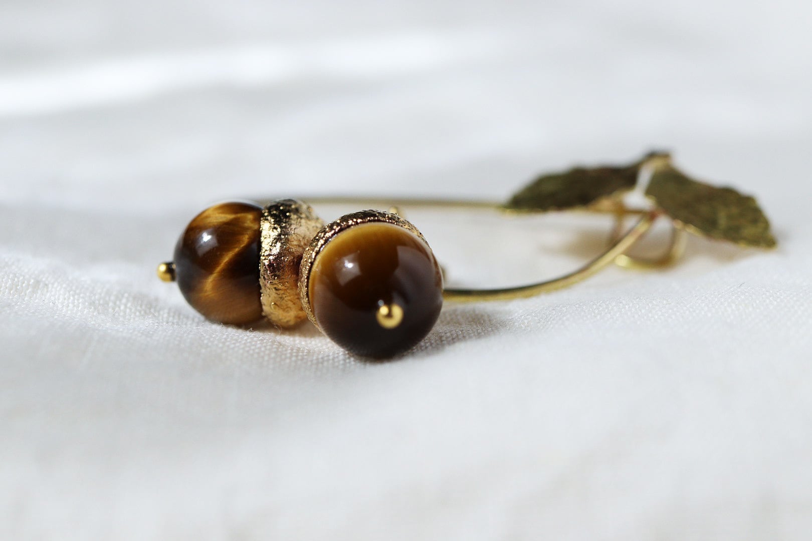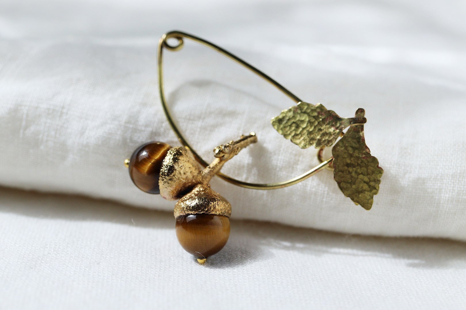 ブローチ台と葉っぱは真鍮で作り、タイガーアイを合わせて仕立てました。