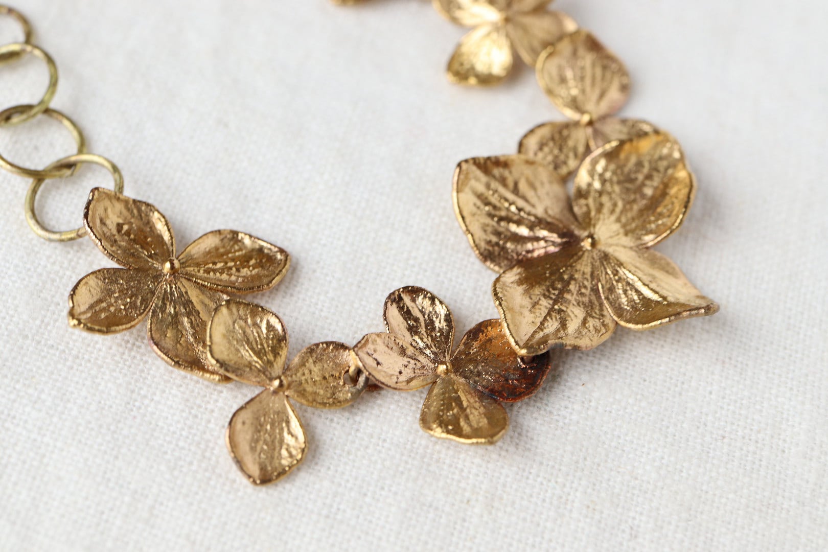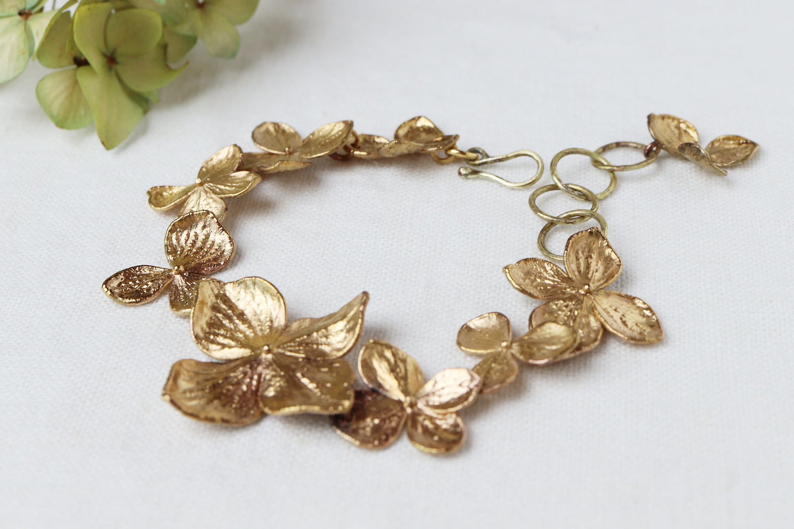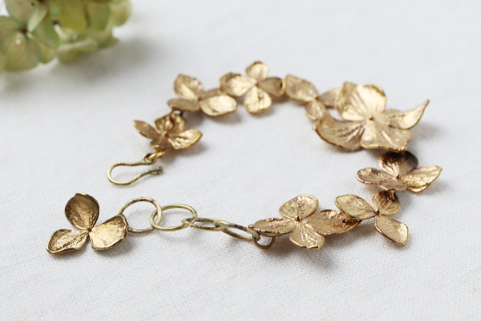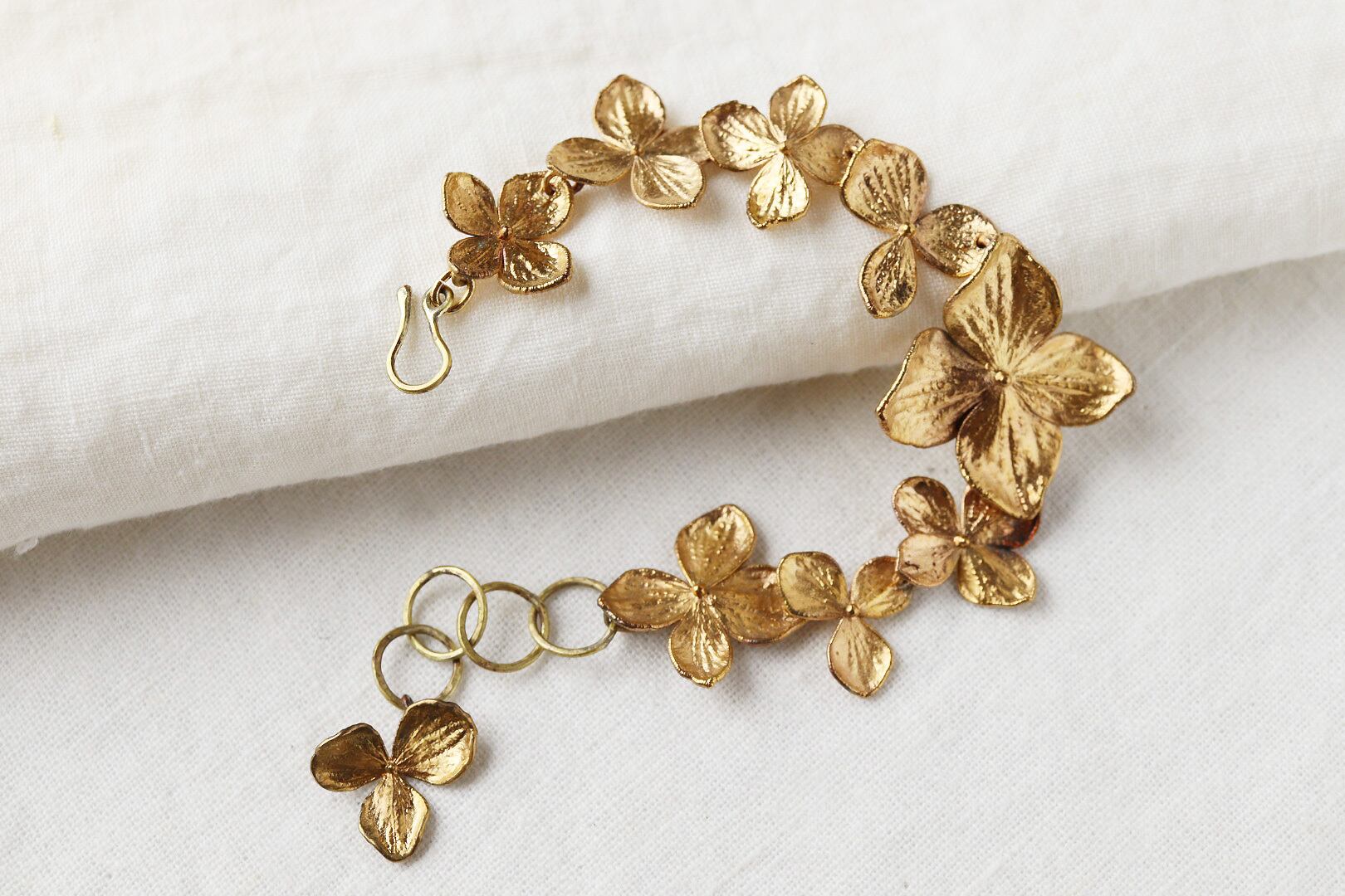 アジサイの花弁を、そっと金属で包んだブレスレットです。